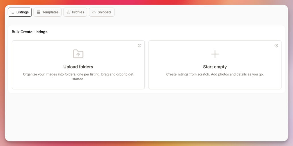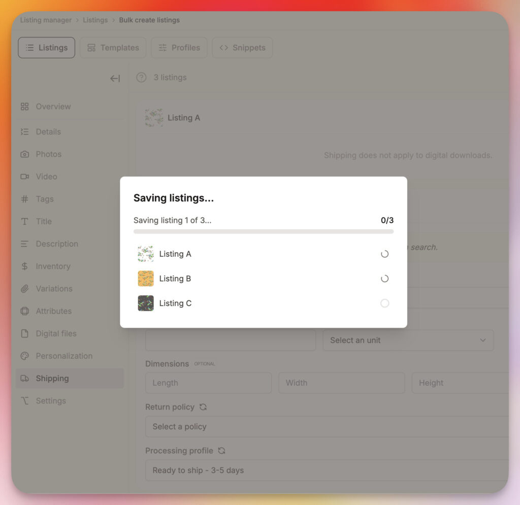 The editing step is still per listing. Bulk Create handles the setup and the batching, not bulk field edits. So you are not changing a tag across 50 listings in one click (yet). What you are doing is collapsing the “open, create, upload, name, save, repeat” loop into one smooth flow.