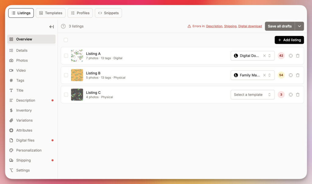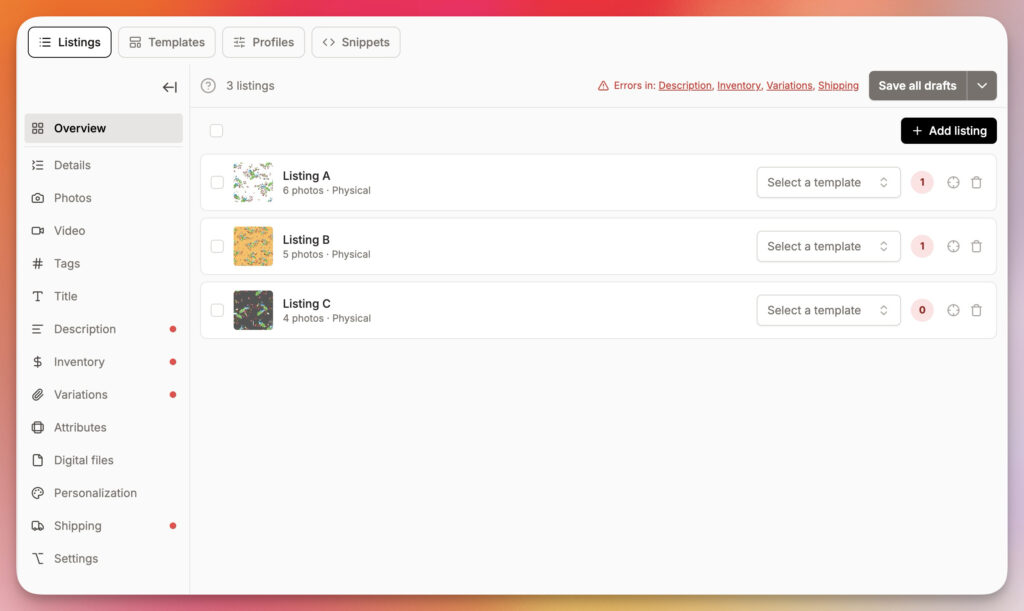This is where it gets good. Every listing you are creating sits side by side in a single overview. You see what is done, what needs attention, and where the errors are. No more tab purgatory.