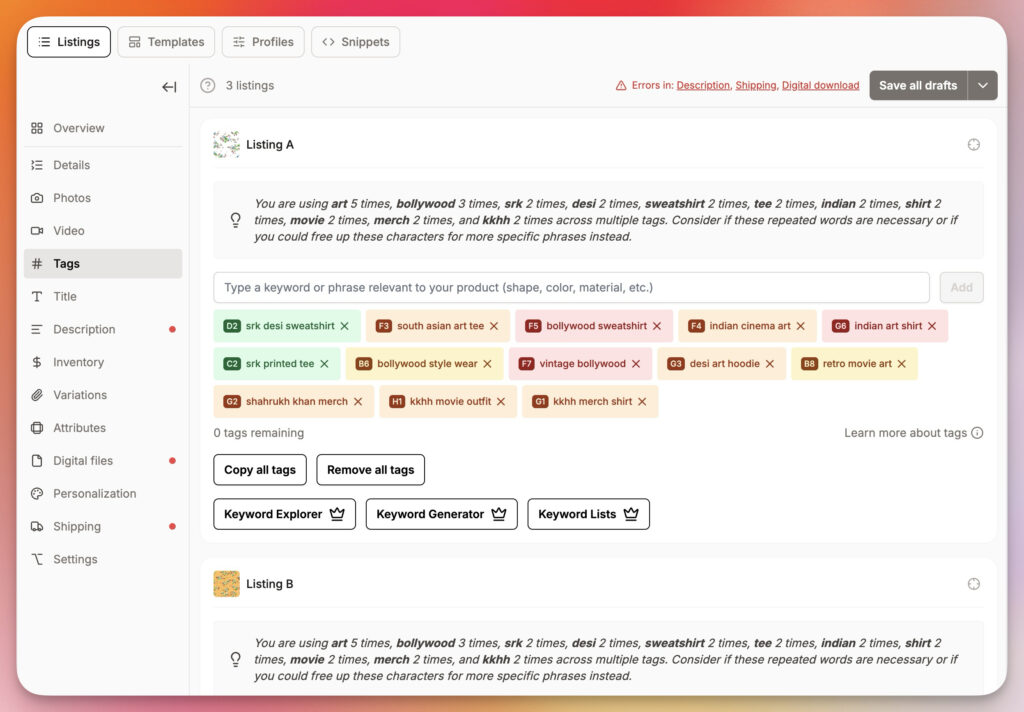 Tags, titles, descriptions. Every Listadum tool you already use is available on each listing in the batch. Keyword Explorer, Keyword Generator, Keyword Lists, quality checks, tag analysis. Work through one listing, move to the next, keep going.